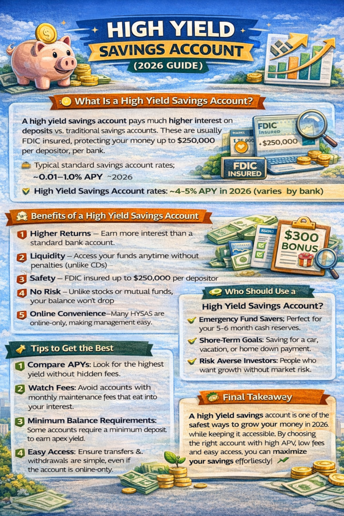 A high yield savings account is one of the safest ways to grow your money in 2026 while keeping it accessible. By choosing the right account with high APY, low fees, and easy access, you can maximize your savings effortlessly.