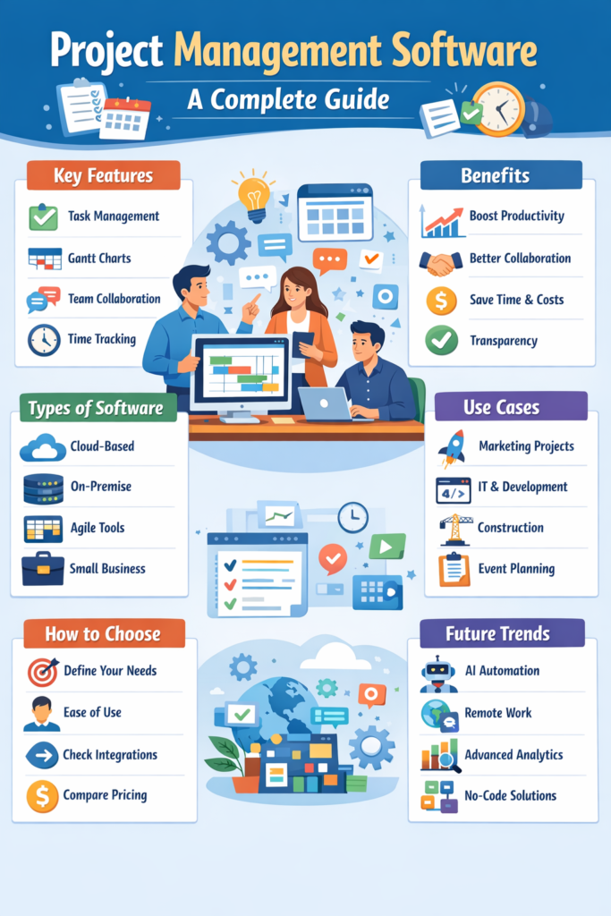 This in-depth guide explains what project management software is, how it works, its benefits, features, types, pricing models, and how to choose the best tool for your needs.