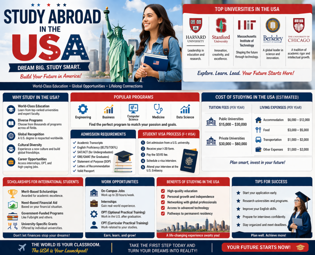 If you’re planning to study abroad in the USA, this complete guide will walk you through everything—from choosing universities and programs to visas, costs, and future opportunities.